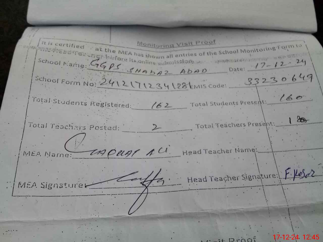 | Attendance Register | Head Teacher | MEA with School | Visit Proof |