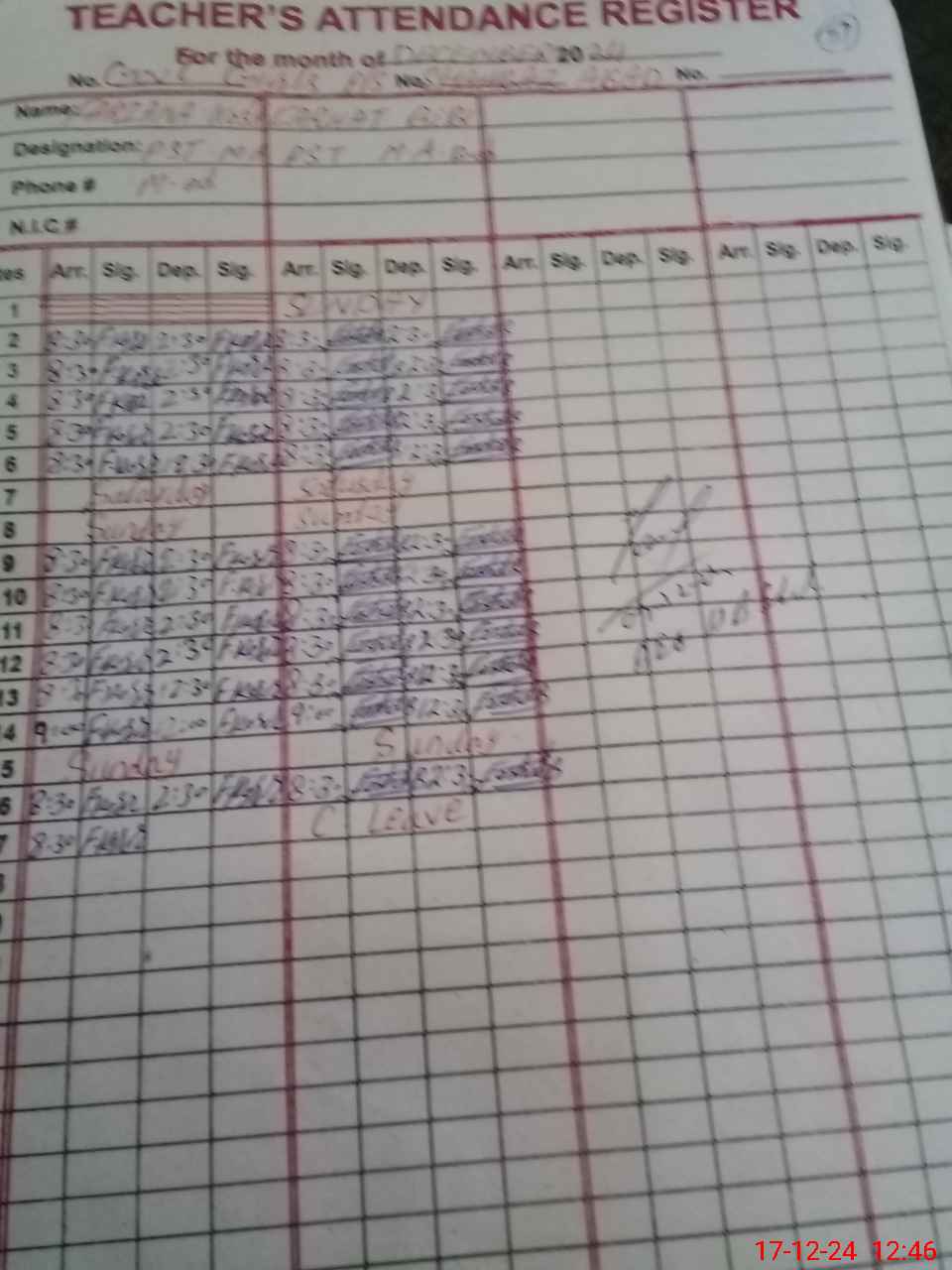| CNIC | Full Name | Designation | R/C | Absence During Last Calender Month |
