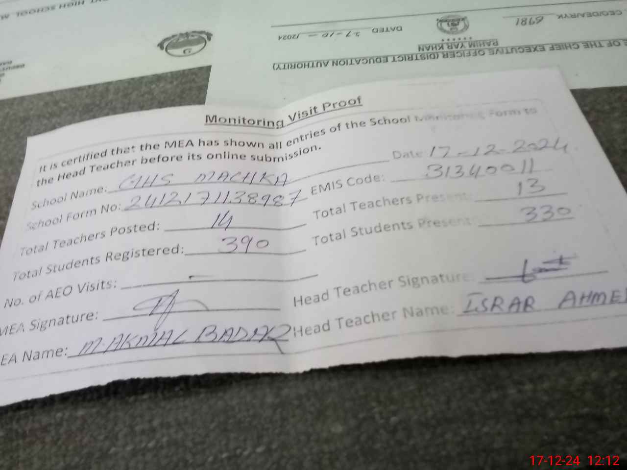 | Certified that this School was Inspected by the Undersigned MEA/DMO Today and the Information Stated Above is as Per Record. | |||||
