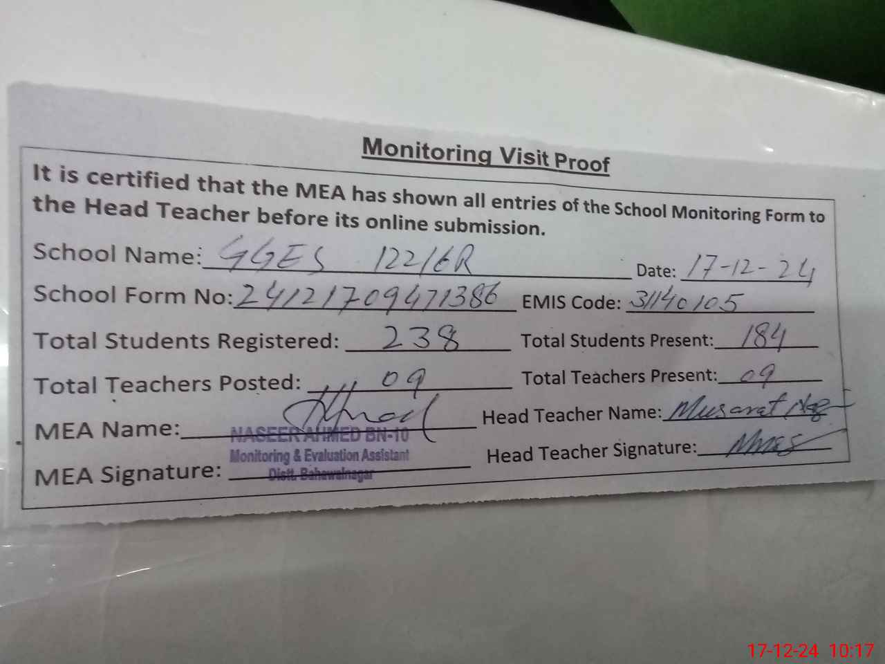 | Attendance Register | Head Teacher | MEA with School | Visit Proof |
