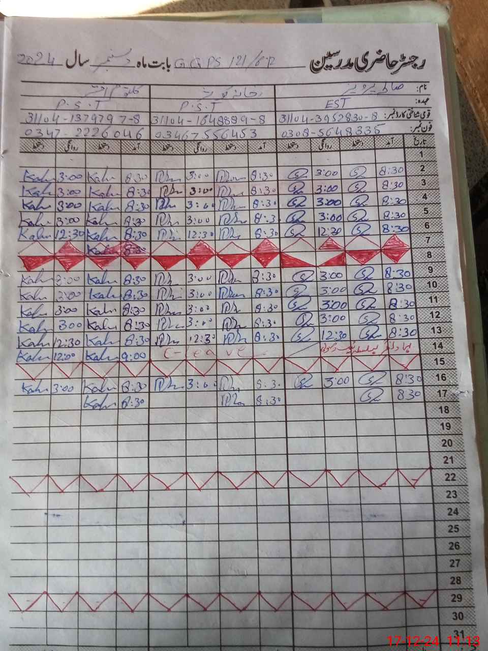 | CNIC | Full Name | Designation | R/C | Absence during last cal. month |