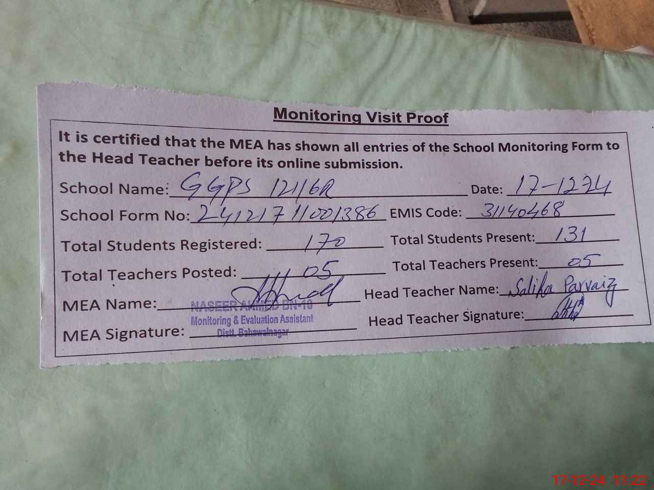 | Attendance Register | Head Teacher | MEA with School | Visit Proof |