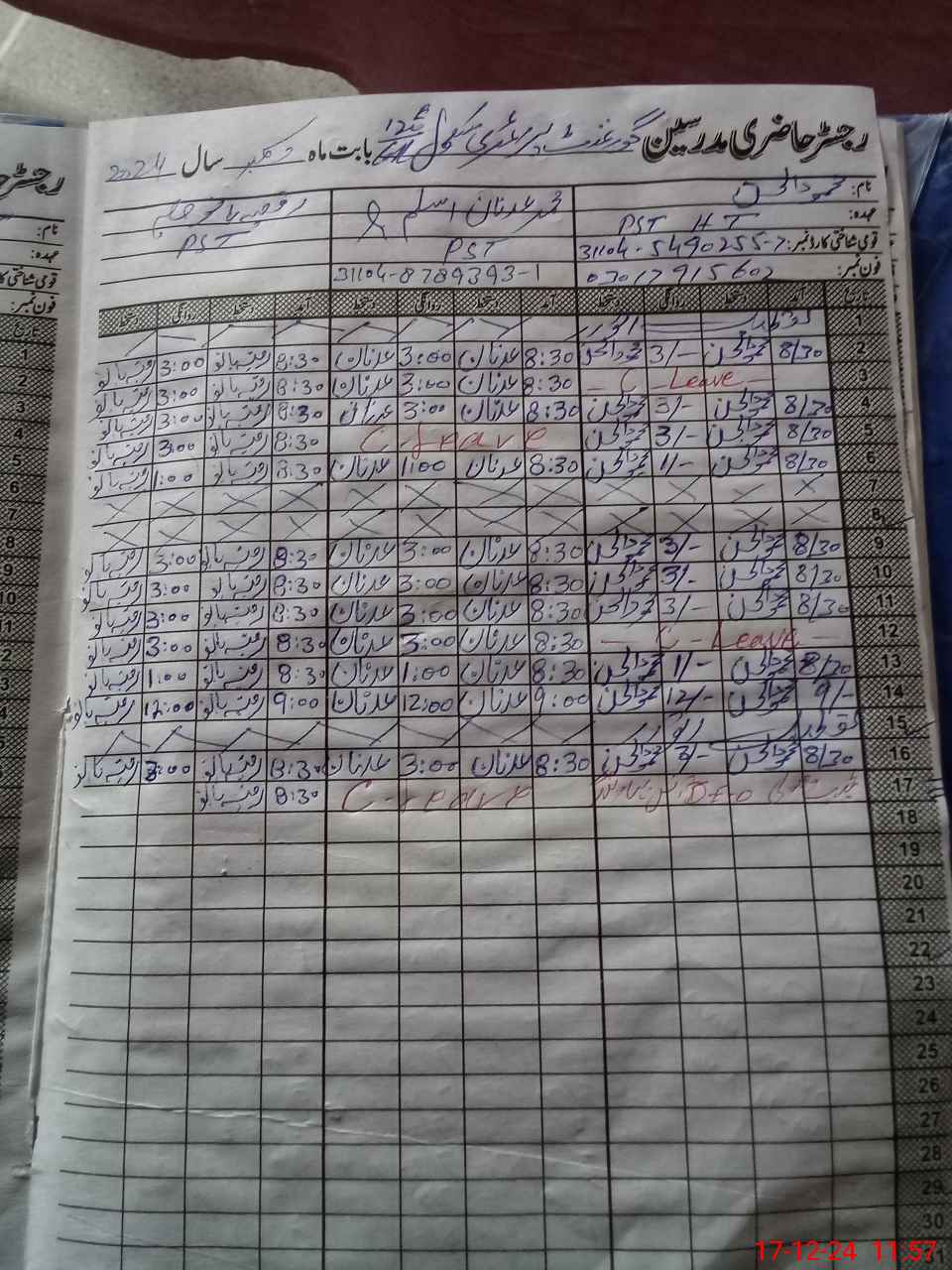 | CNIC | Full Name | Designation | R/C | Absence During Last Calender Month |