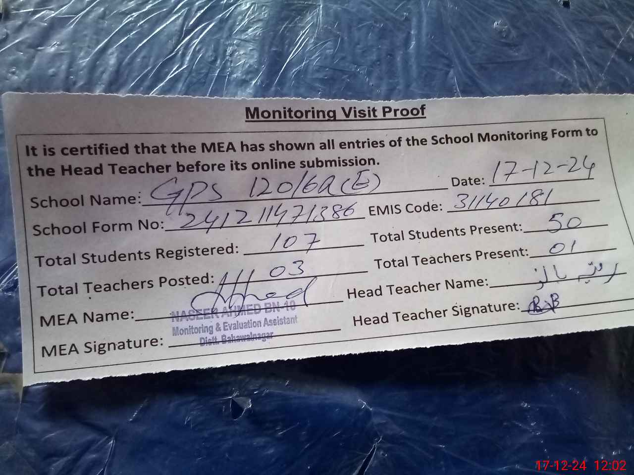 | Attendance Register | Head Teacher | MEA with School | Visit Proof |