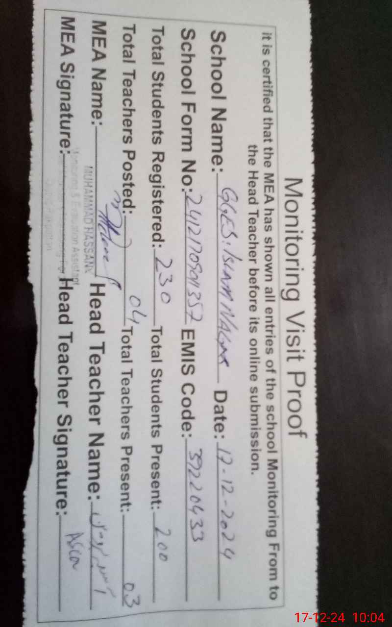 | EMIS Code: 39220433 | Name of School: GGES ISLAM NAGAR NO 1 | |||
