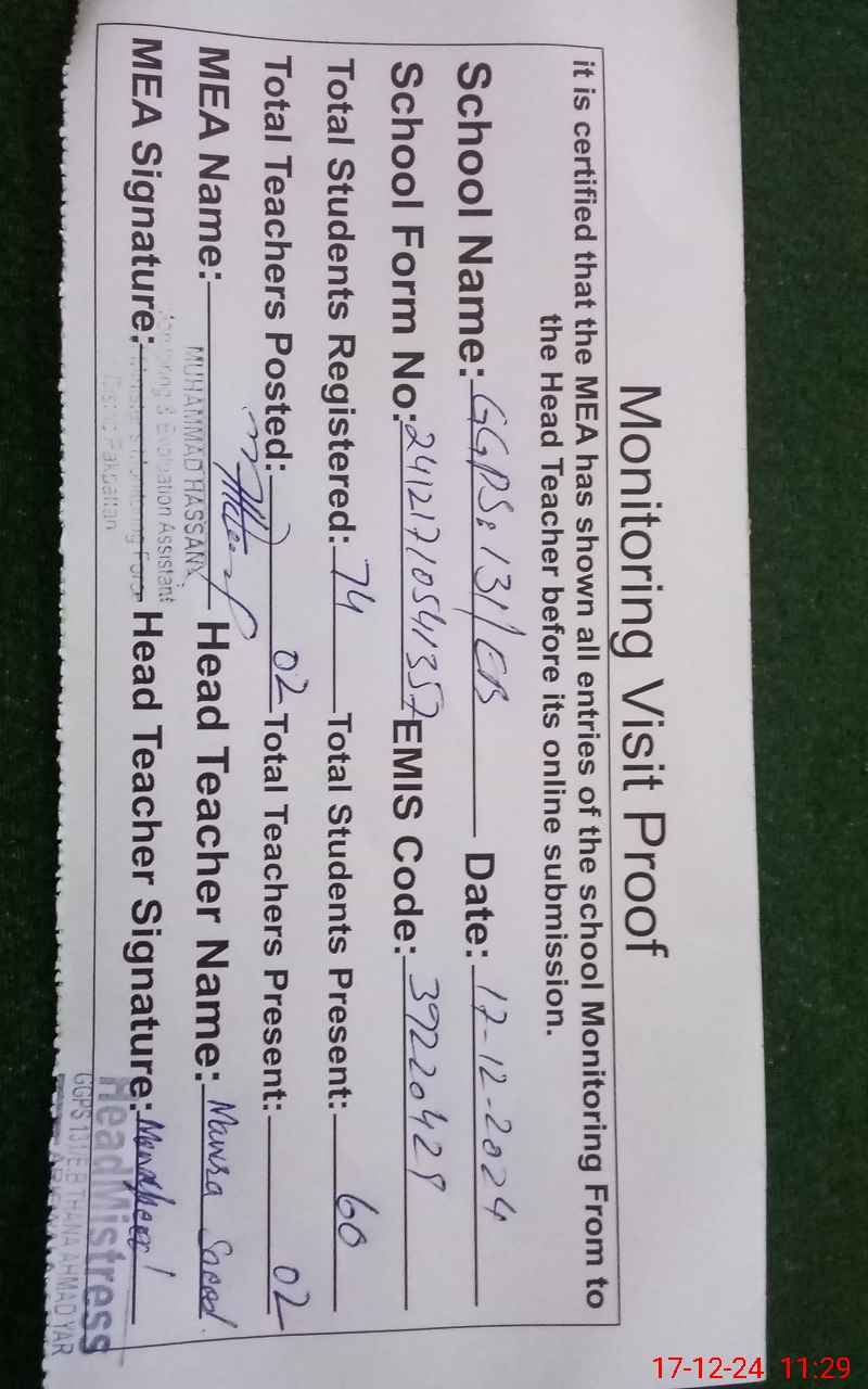 | Attendance Register | Head Teacher | MEA with School | Visit Proof |
