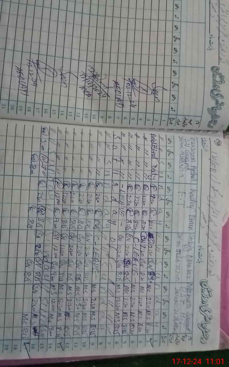 | CNIC | Full Name | Designation | R/C | Absence During Last Calender Month |