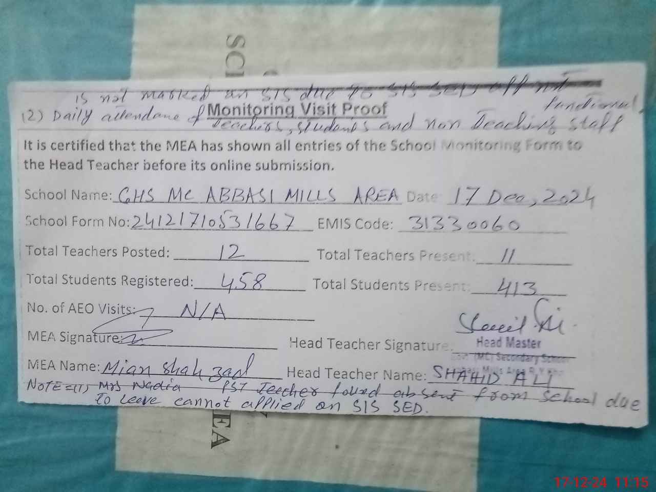 | Remarks (Use Separate Page if Required): 1 Mrs Nadia Bostan PST teacher found absent from school during visit due to leave cannot applied on new SIS SED app 2 Daily attendance of teachers students and non teaching staff is not marked on SIS due to new SIS SED app not functional | |||||