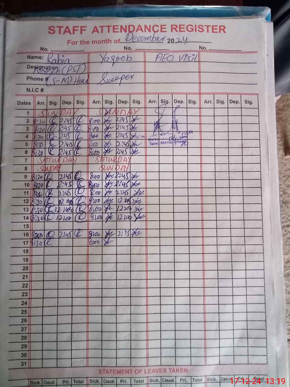 | CNIC | Full Name | Designation | R/C | Absence during last cal. month |