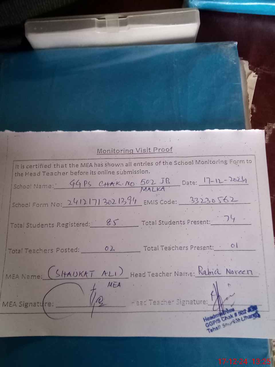 | Attendance Register | Head Teacher | MEA with School | Visit Proof |