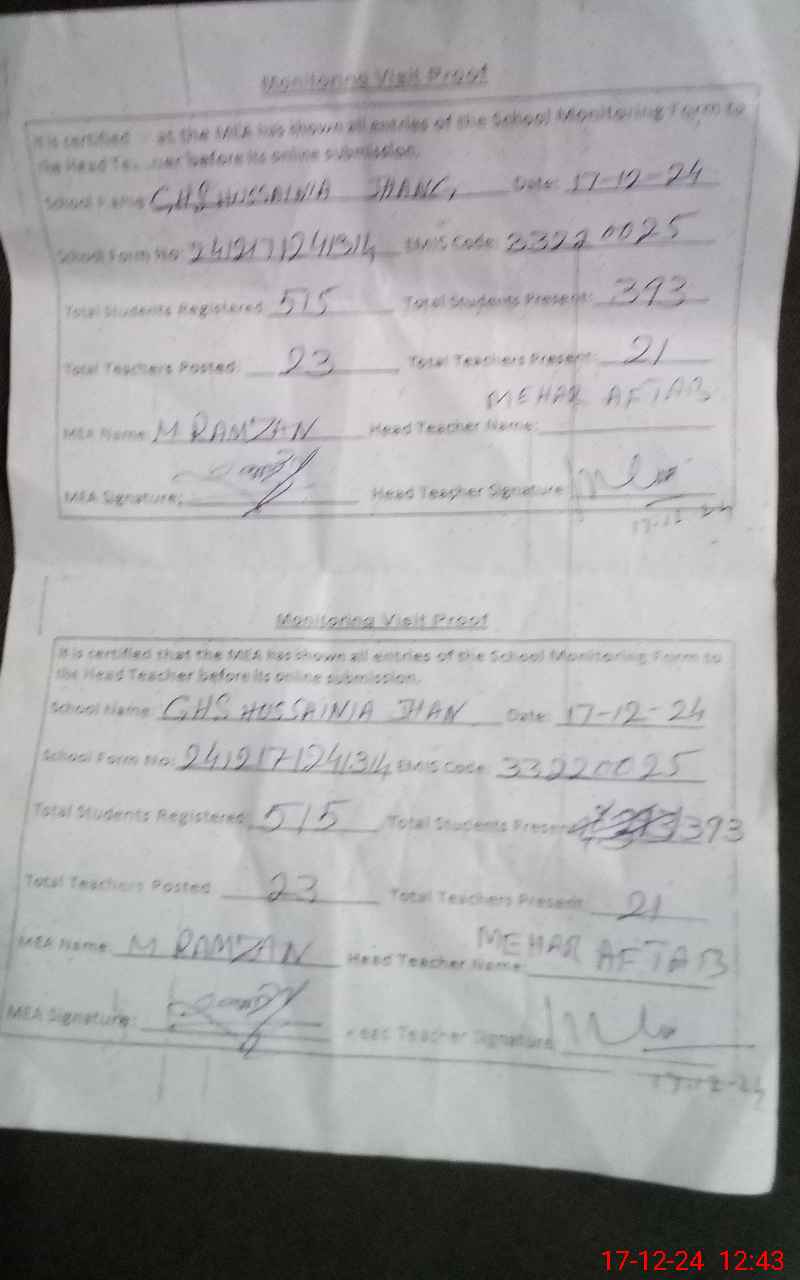 | EMIS Code: 33220025 | Name of School: GHS HUSSAINIA, JHANG | |||