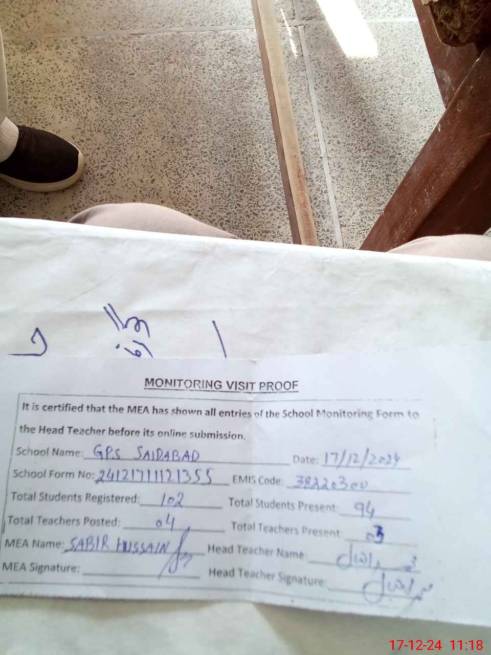 | EMIS Code: 38220300 | Name of School: GPS SAIDABAD DAKHLI SHAH WALA JANUBI | |||