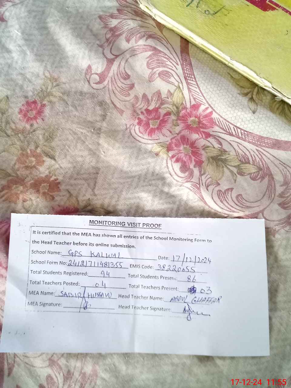 | Attendance Register | Head Teacher | MEA with School | Visit Proof |