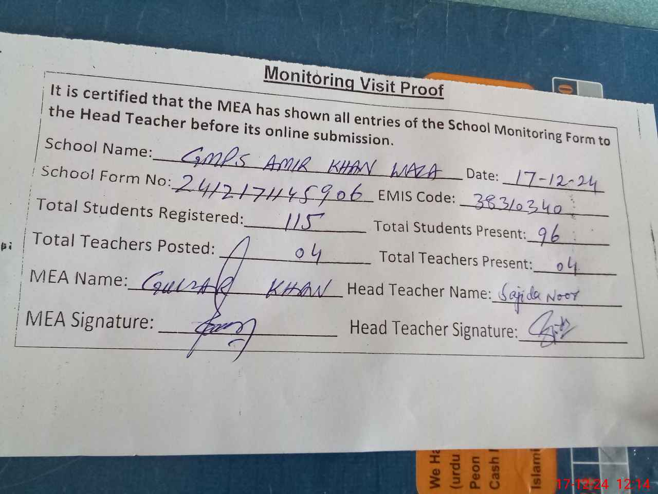 | Attendance Register | Head Teacher | MEA with School | Visit Proof |