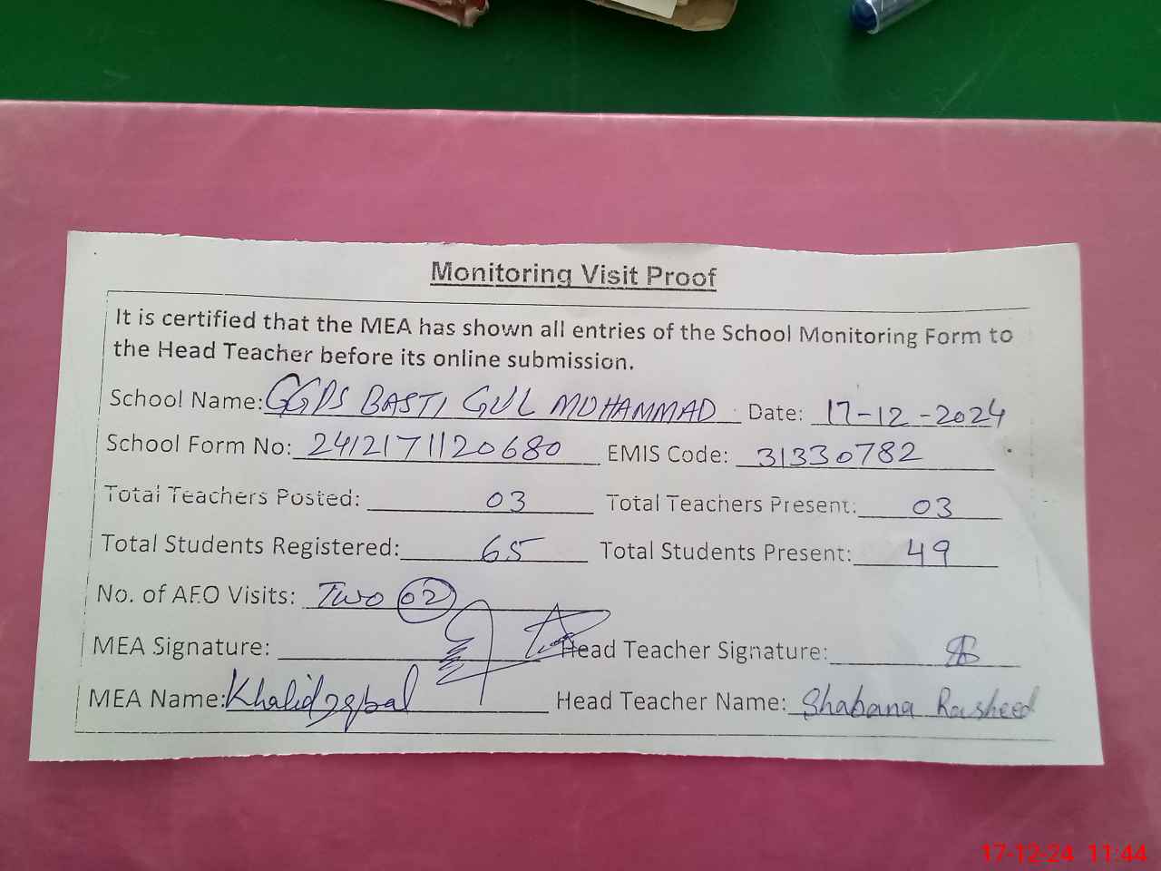 | Attendance Register | Head Teacher | MEA with School | Visit Proof |