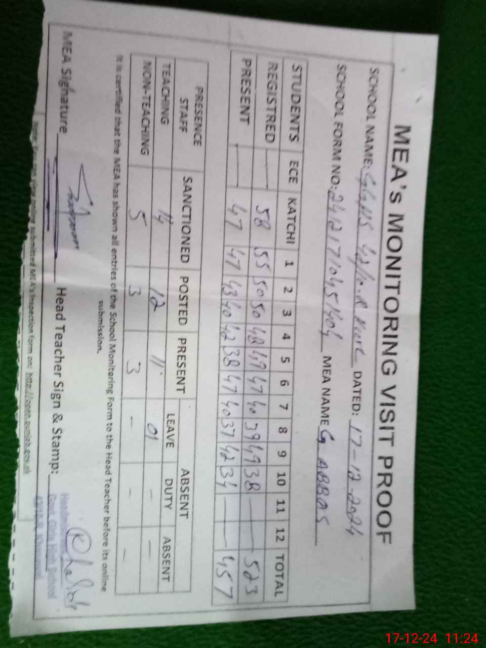 | Attendance Register | Head Teacher | MEA with School | Visit Proof |