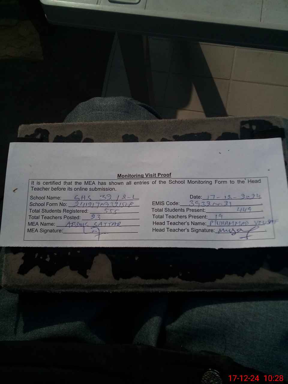 | Attendance Register | Head Teacher | MEA with School | Visit Proof |
