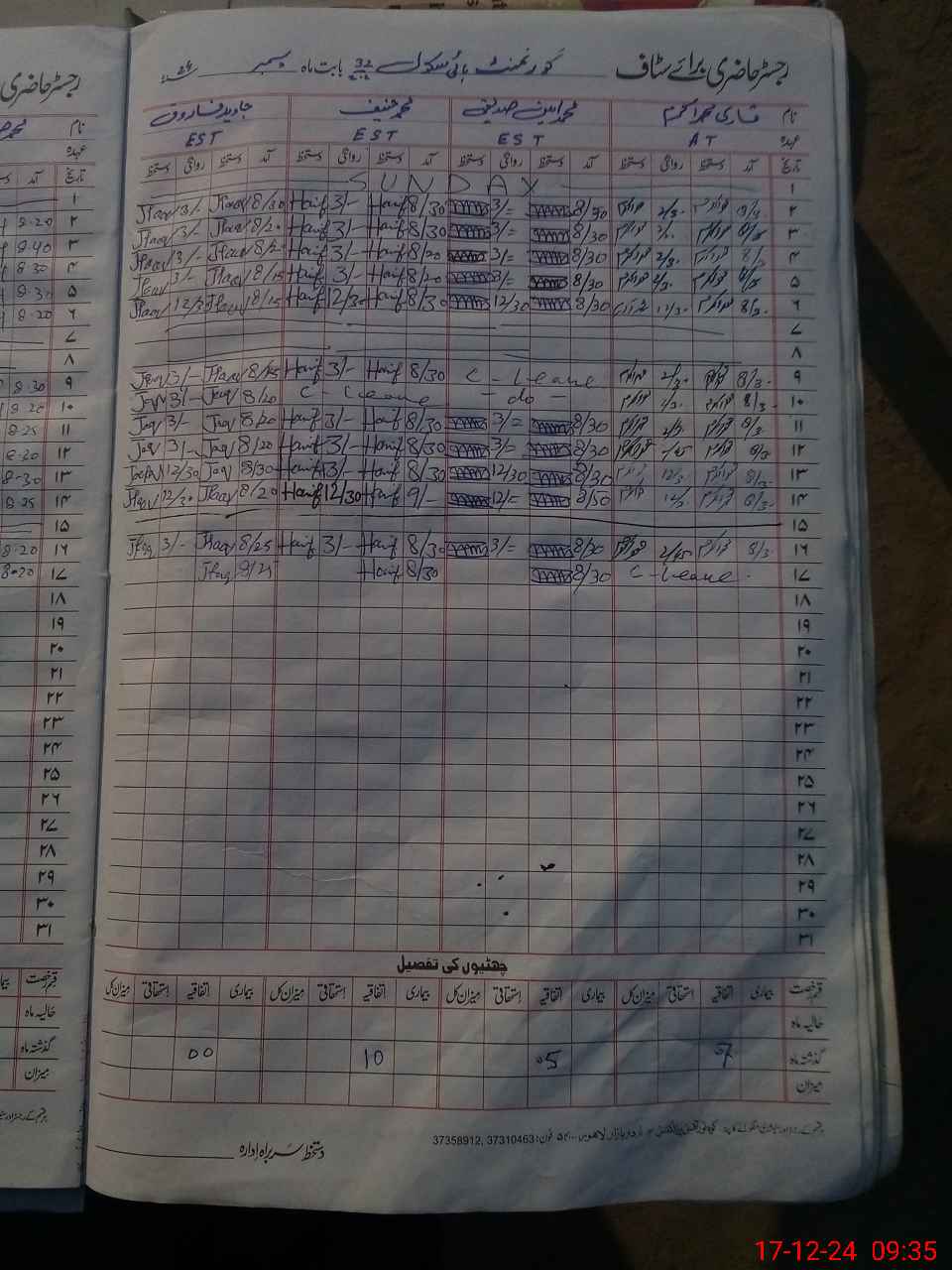 | CNIC | Full Name | Designation | R/C | Absence During Last Calender Month |