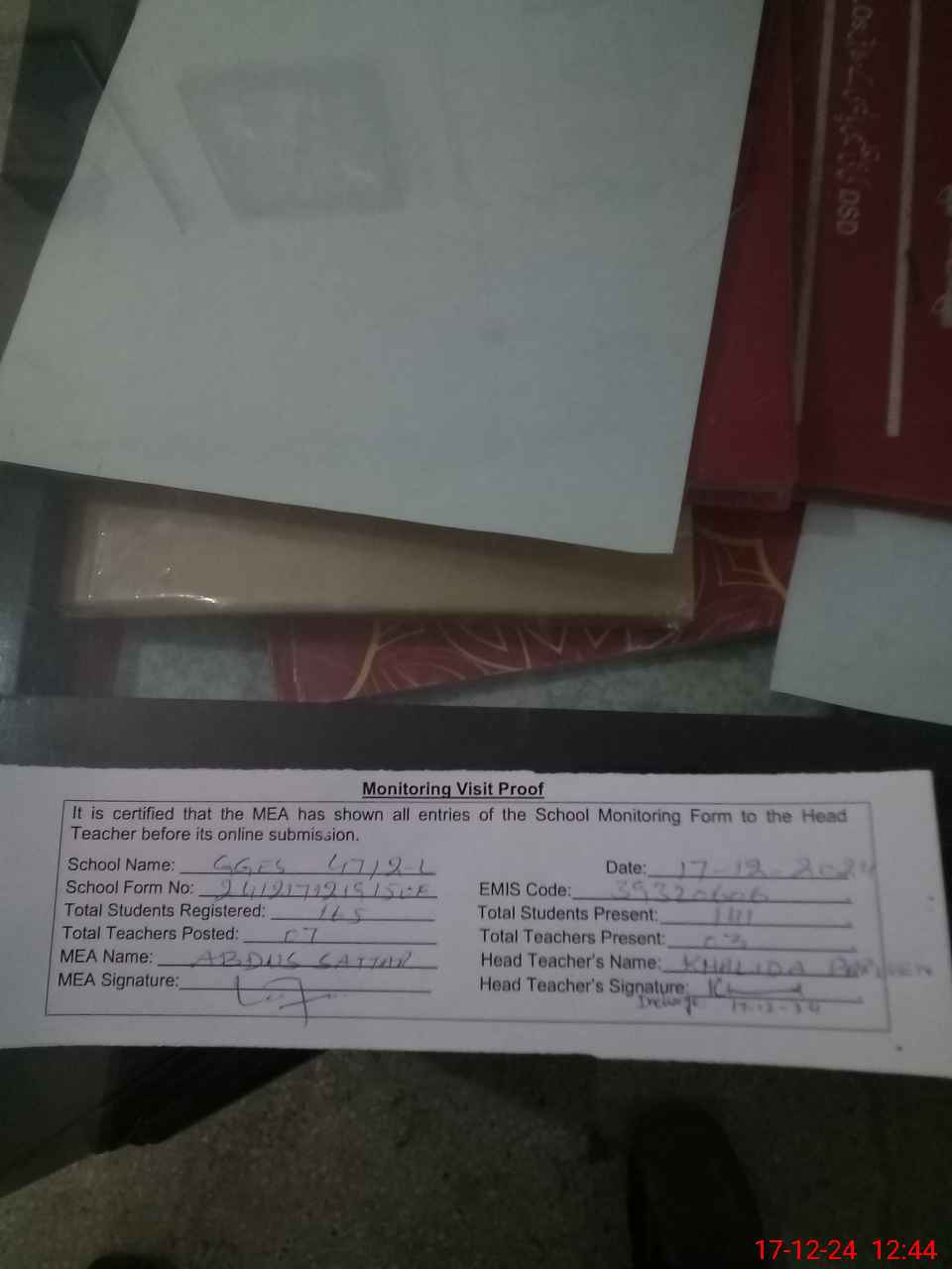 | Attendance Register | Head Teacher | MEA with School | Visit Proof |