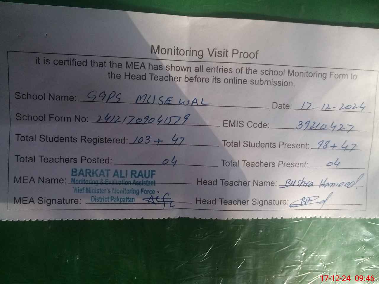 | Attendance Register | Head Teacher | MEA with School | Visit Proof |