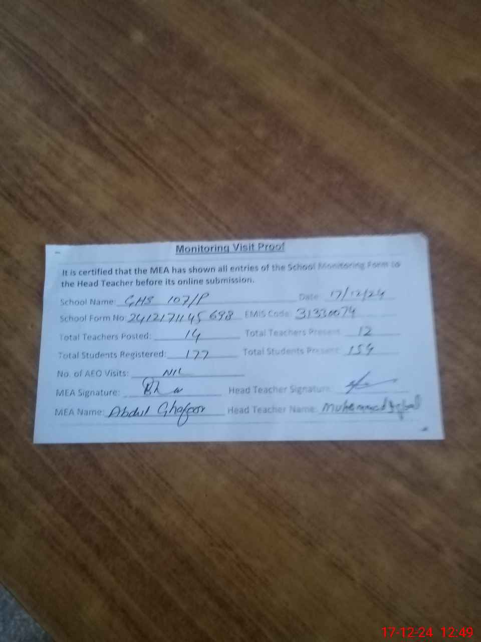 | EMIS Code: 31330074 | Name of School: GHS CHAK NO.107/P | |||