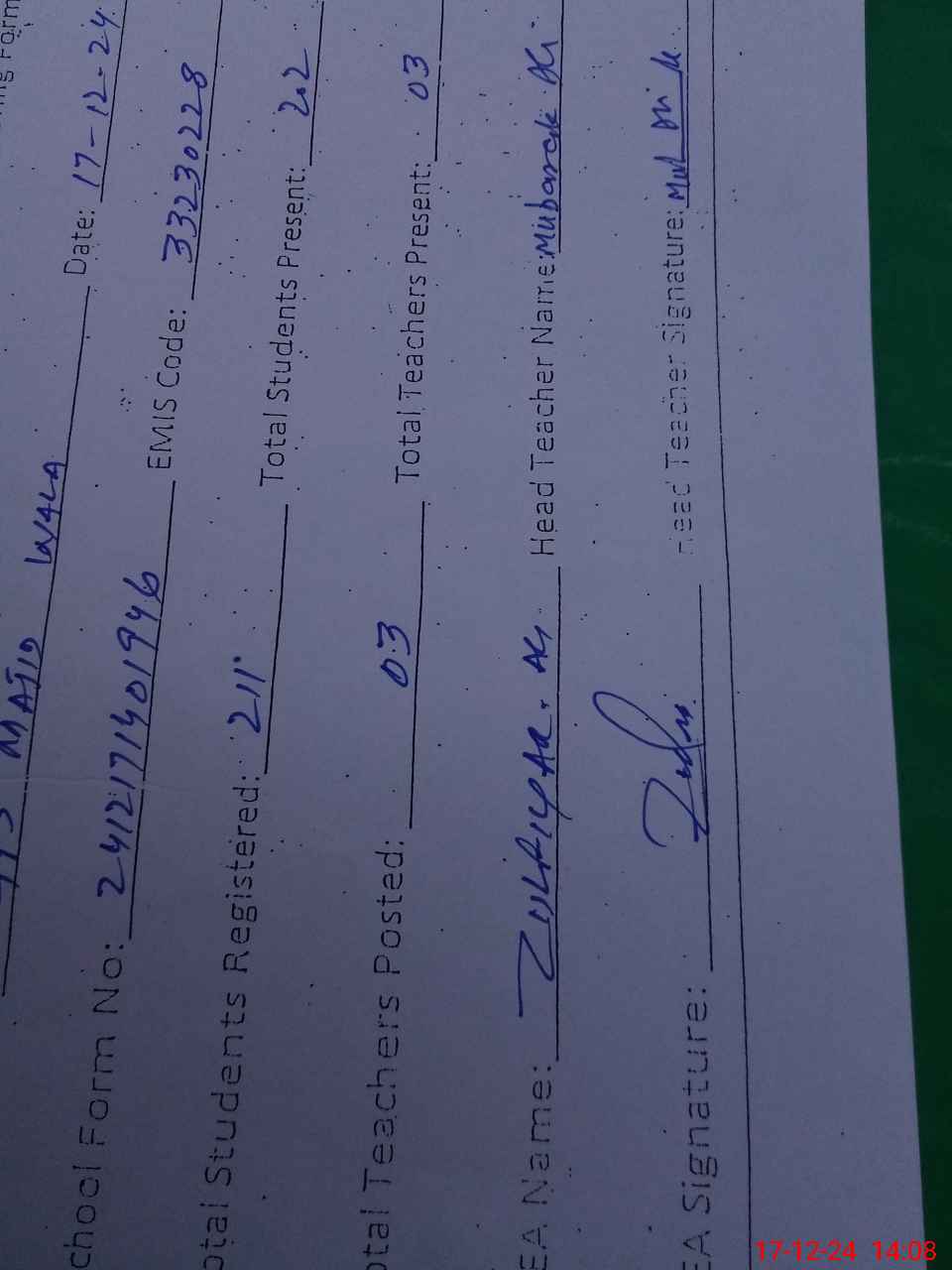 | Name: MU**** AL**** Designation: (School Headmaster's/Headmistress's) PST Phone/Cell Number: 03**** |