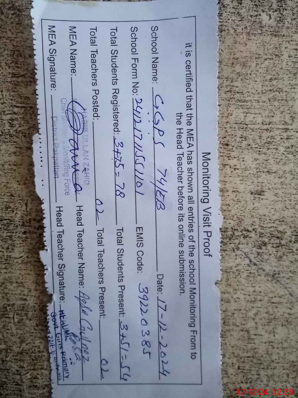 | EMIS Code: 39220385 | Name of School: GGPS 74 EB ARIFWALA | |||