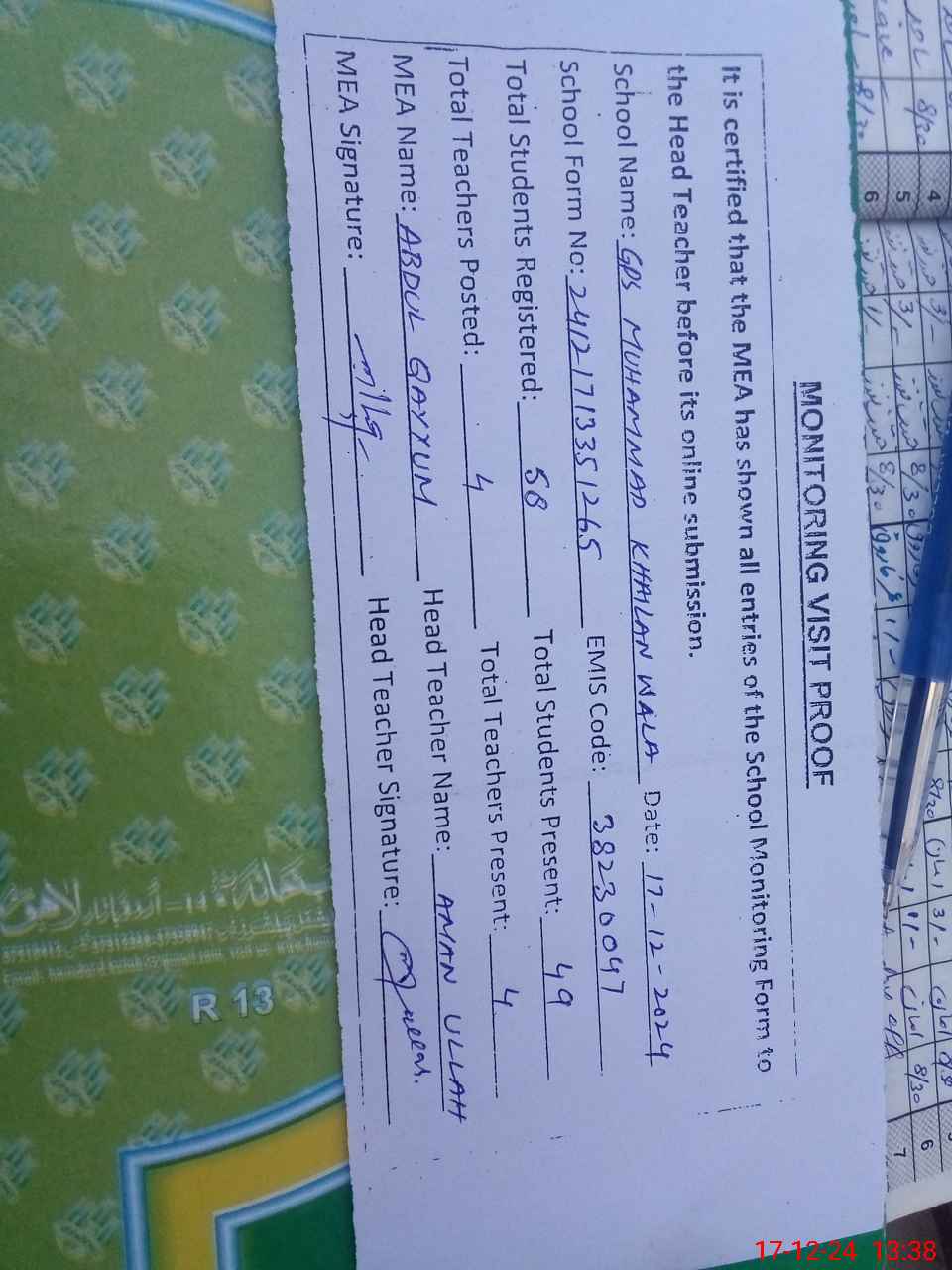 | EMIS Code: 38230047 | Name of School: GPS MUHAMMAD KHAILAN WALA BANDIAL | |||