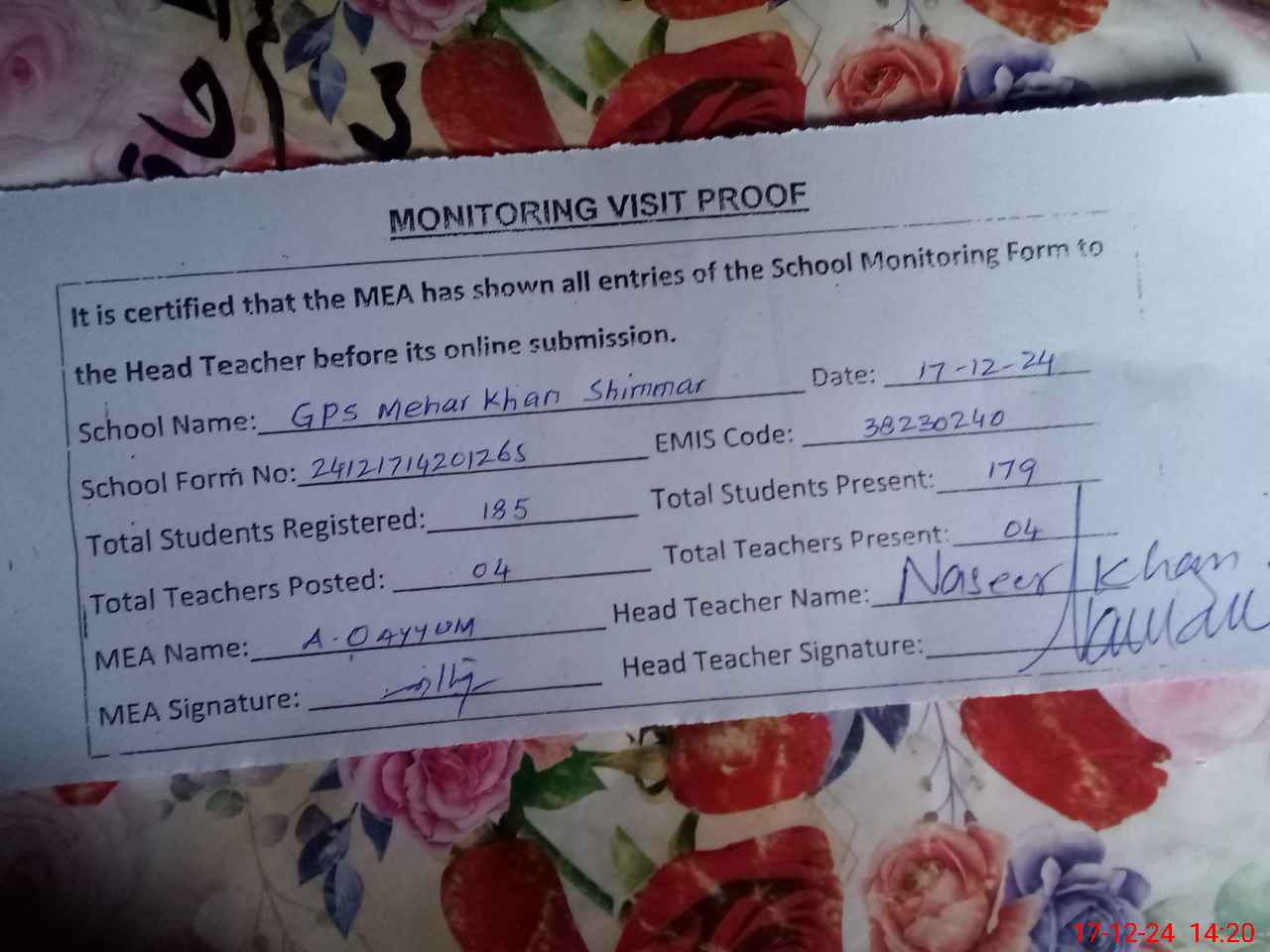 | EMIS Code: 38230240 | Name of School: GPS MEHR KHAN SHIMAR | |||