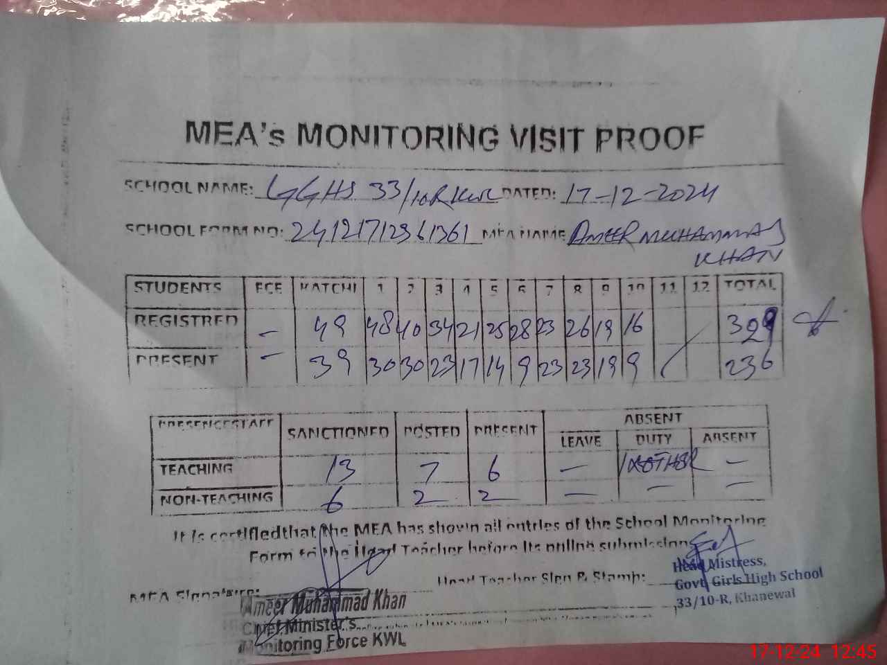 | Attendance Register | Head Teacher | MEA with School | Visit Proof |