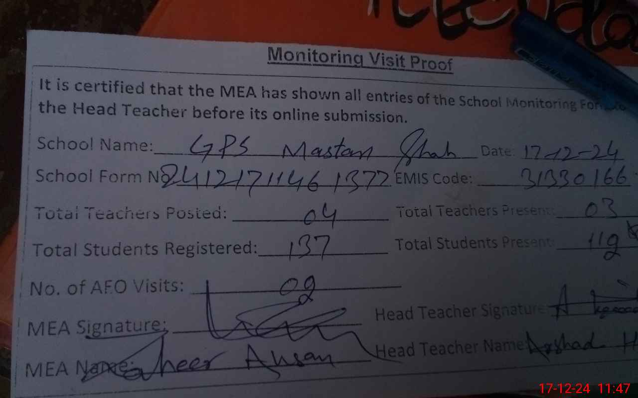 | Attendance Register | Head Teacher | MEA with School | Visit Proof |