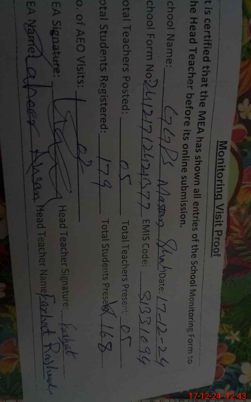 | EMIS Code: 31331094 | Name of School: GGPS MASTAN SHAH | |||