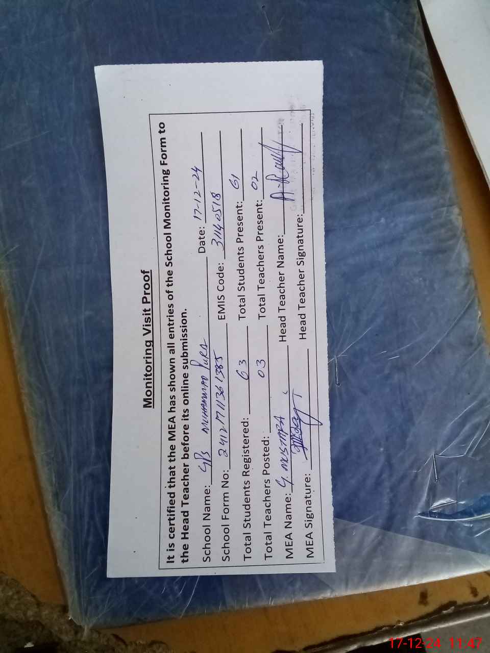 | Attendance Register | Head Teacher | MEA with School | Visit Proof |