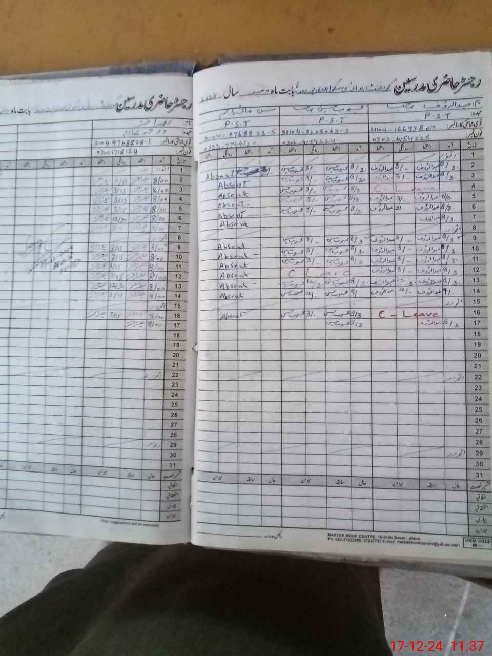 | CNIC | Full Name | Designation | R/C | Absence During Last Calender Month |