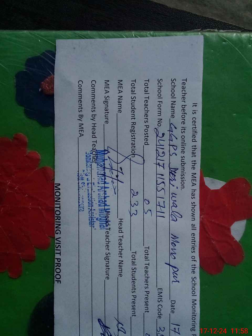 | Attendance Register | Head Teacher | MEA with School | Visit Proof |