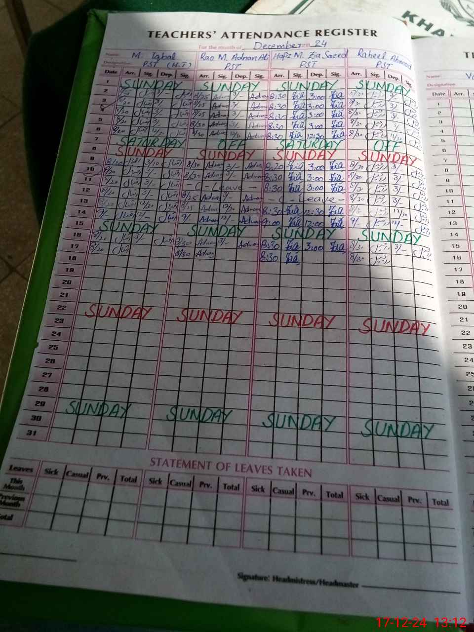| Leave | Duty | Absent | Maternity | Medical | Ex- Pak |