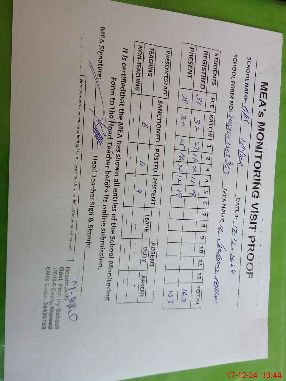 | Attendance Register | Head Teacher | MEA with School | Visit Proof |
