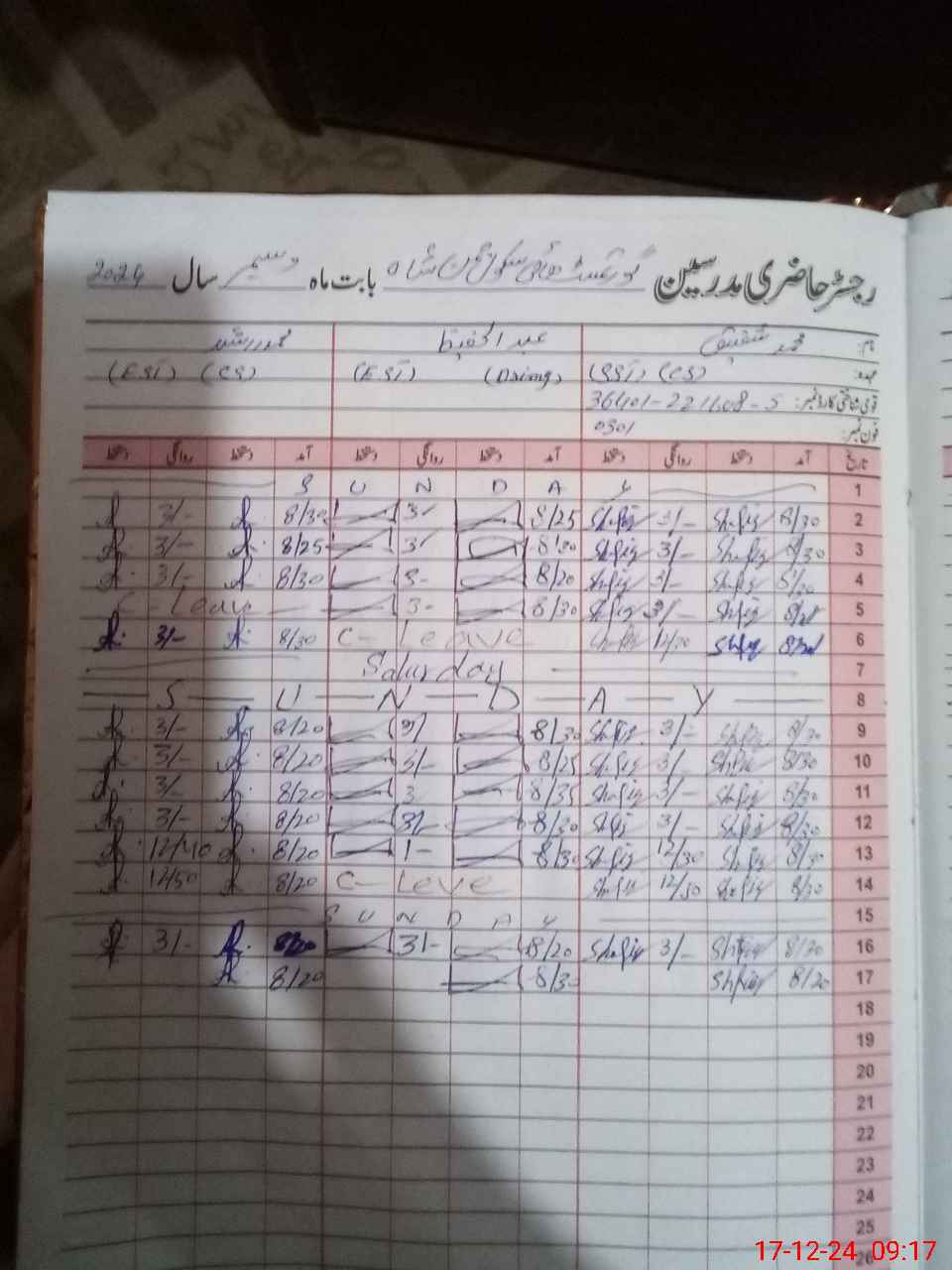 | CNIC | Full Name | Designation | R/C | Absence During Last Calender Month |