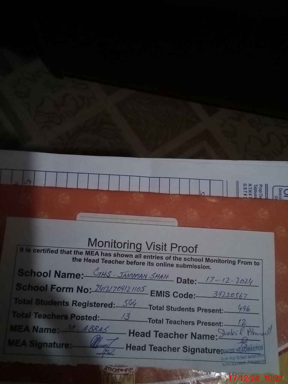 | EMIS Code: 39220567 | Name of School: GHS JUMAN SHAH | |||