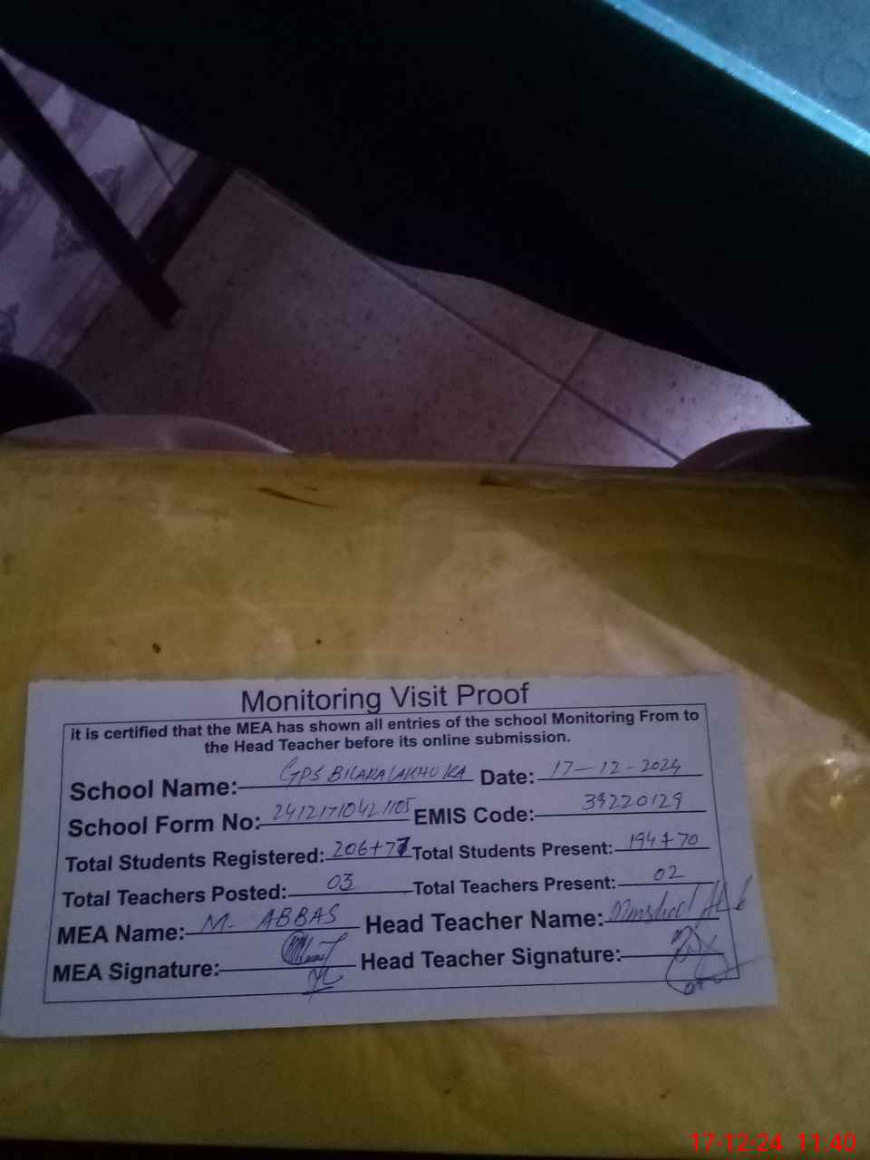 | Attendance Register | Head Teacher | MEA with School | Visit Proof |