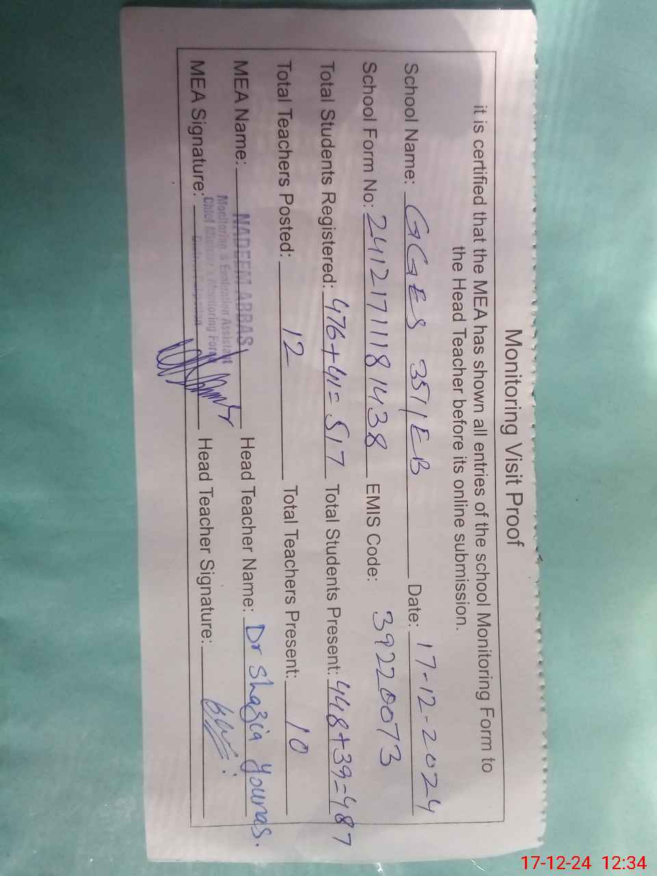 | Certified that this School was Inspected by the Undersigned MEA/DMO Today and the Information Stated Above is as Per Record. | |||||