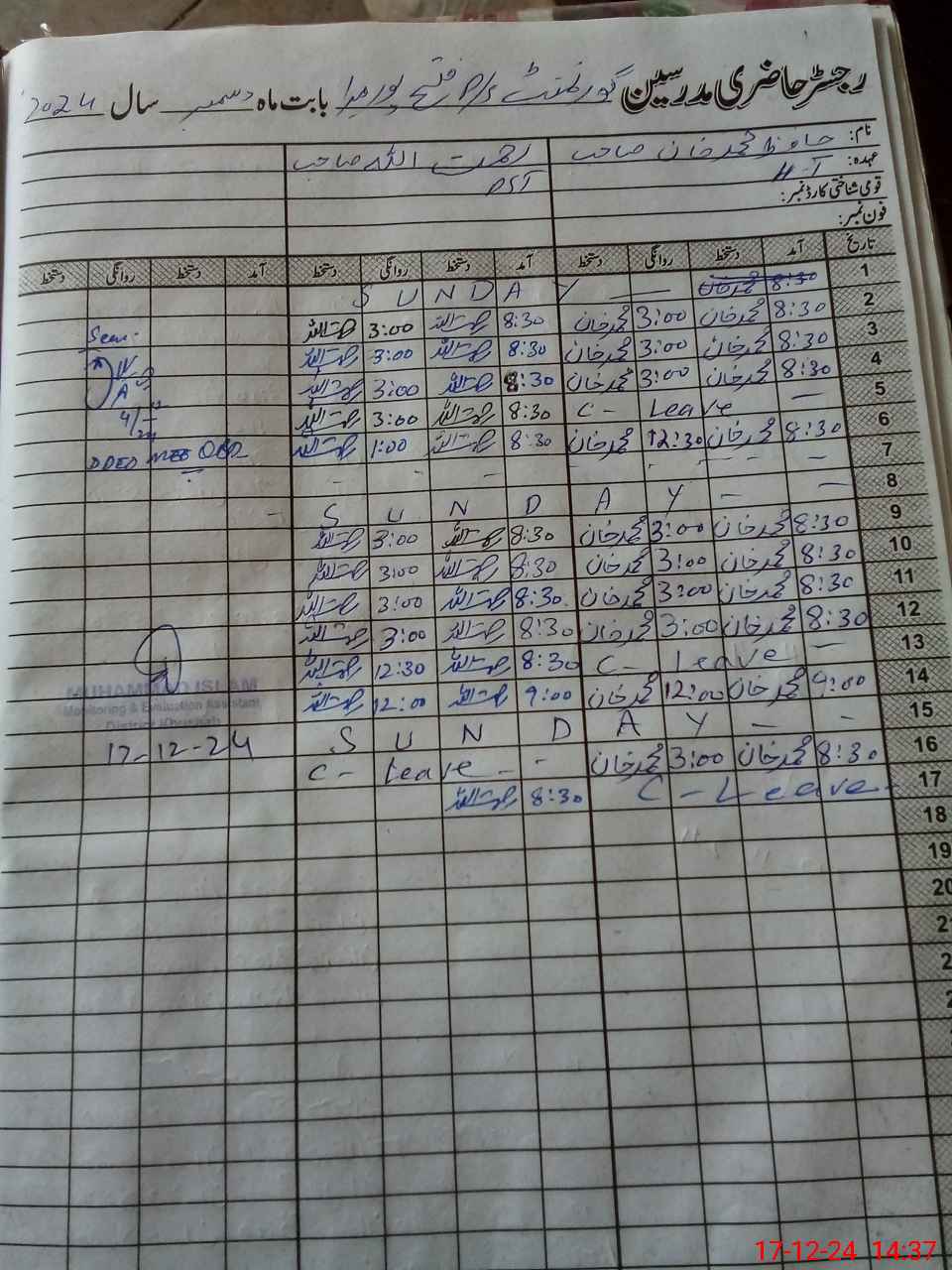 | CNIC | Full Name | Designation | R/C | Absence During Last Calender Month |