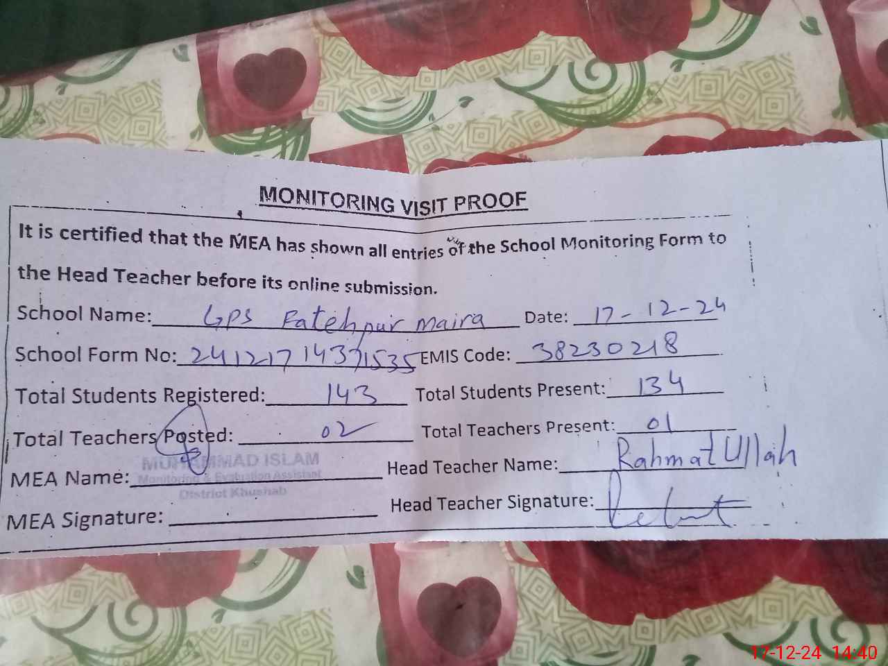 | Attendance Register | Head Teacher | MEA with School | Visit Proof |