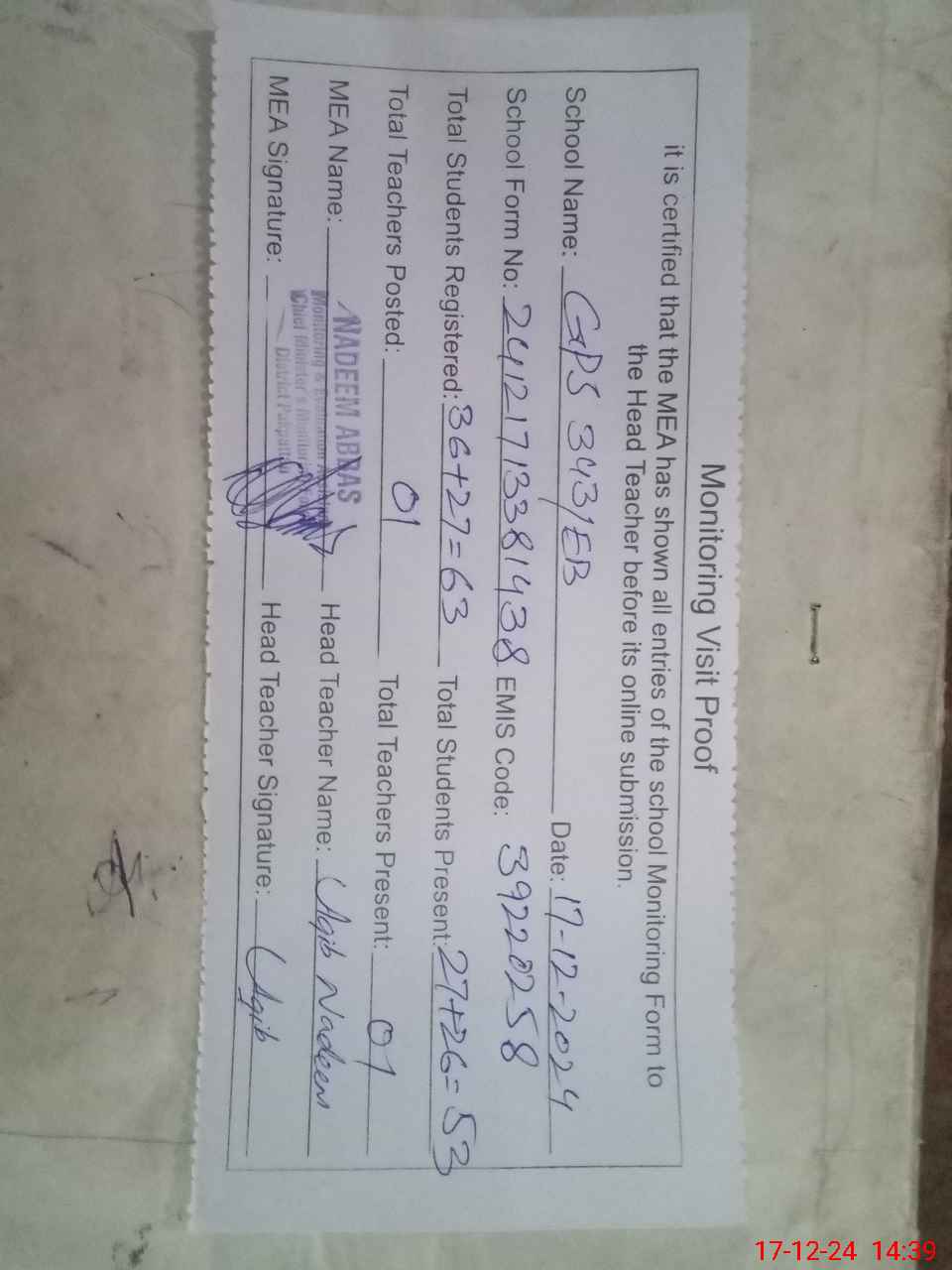 | Attendance Register | Head Teacher | MEA with School | Visit Proof |