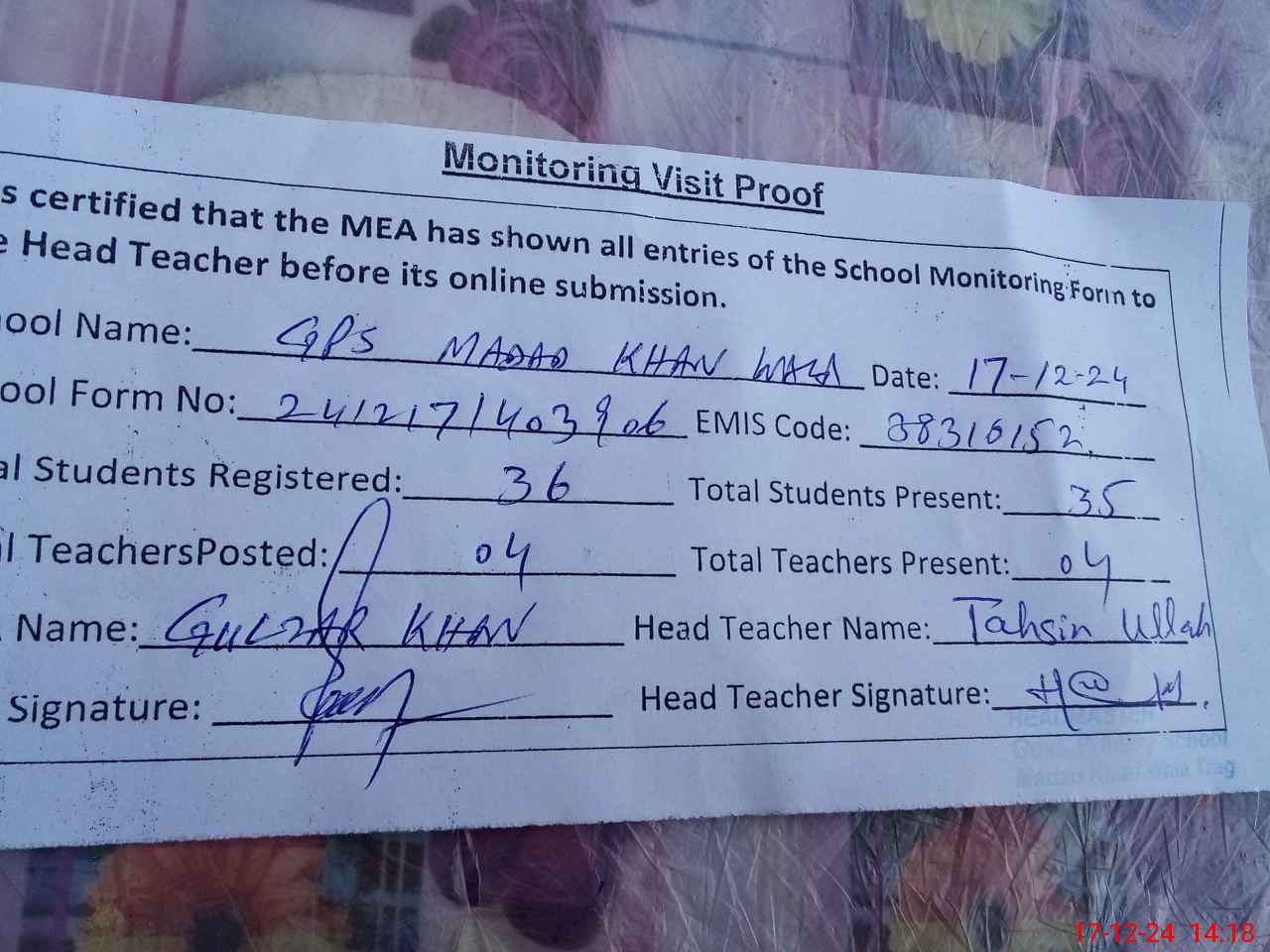 | EMIS Code: 38310152 | Name of School: GPS MADAD KHAN WALA PO TRAG ISA KHEL MIANWALI | |||