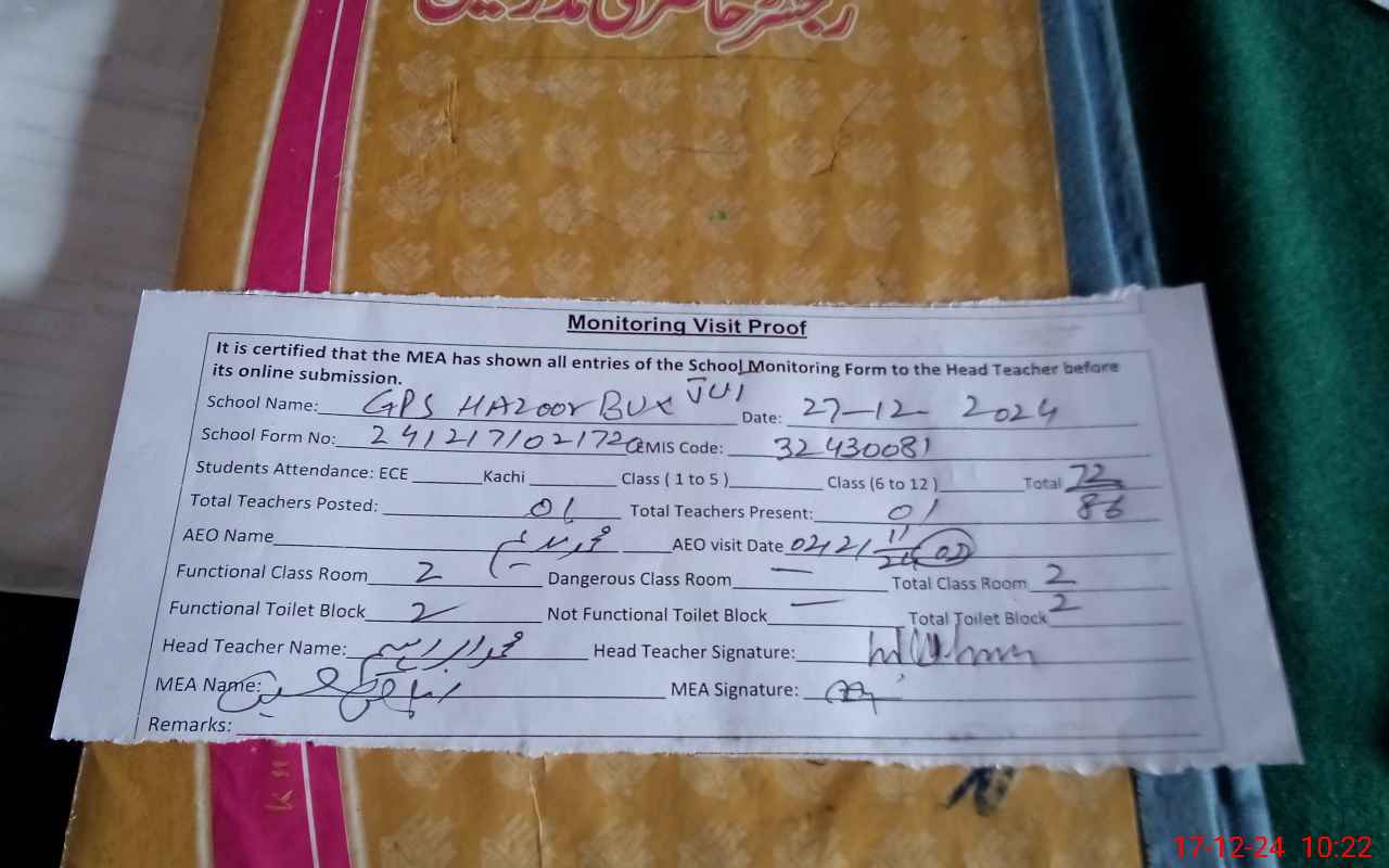 | EMIS Code: 32430081 | Name of School: GPS HAZOOR BUX JUT | |||