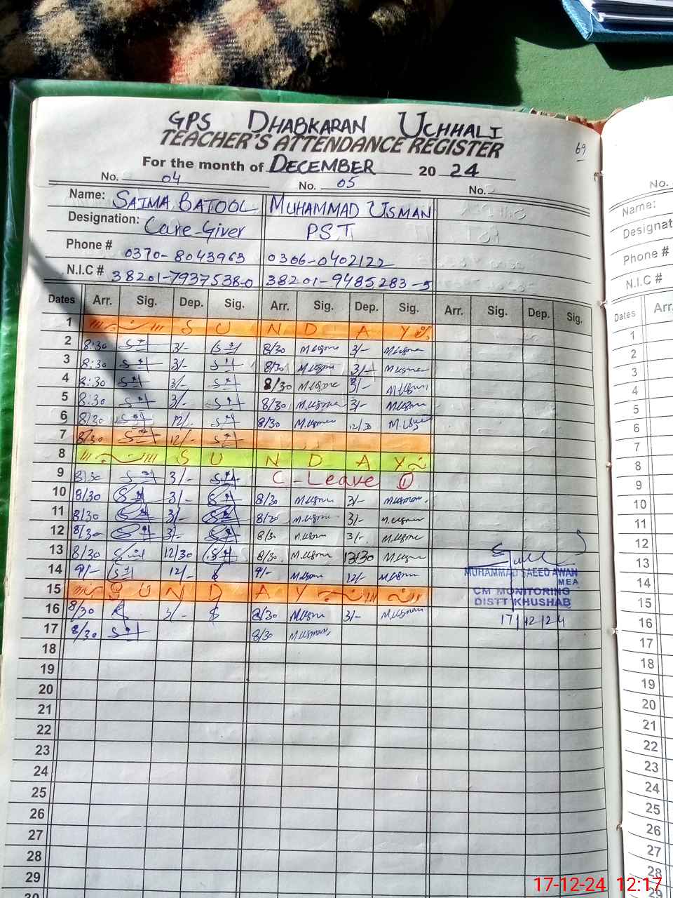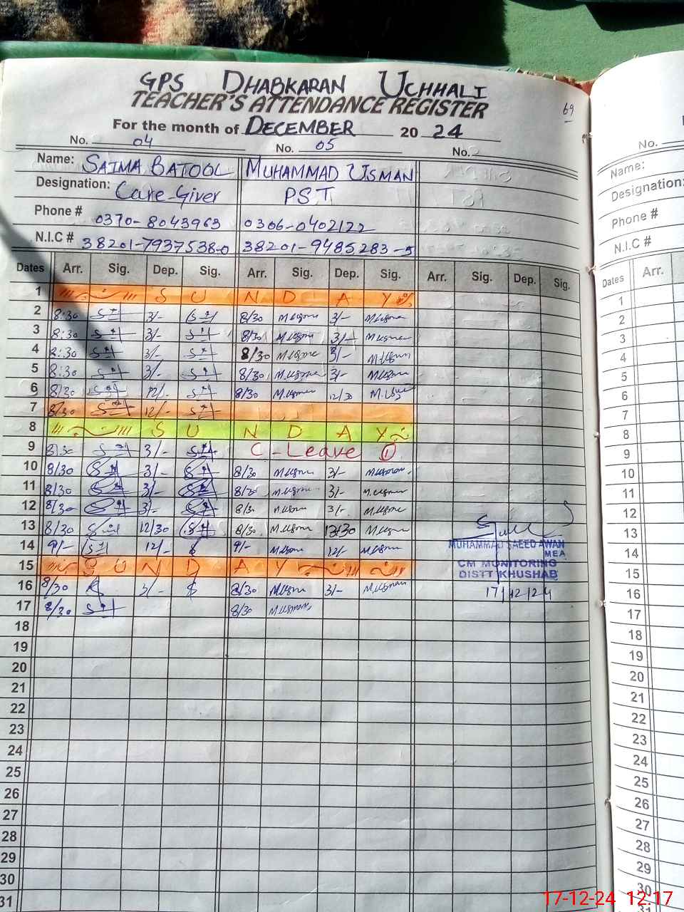 | Remarks (Use Separate Page if Required): NSB record register not maintained after June 2023 NSB record not entered in SIS after June 2023 FTF record not entered in SIS after June 2023 As per Authorized letter notification no SO SNE PMIU 2010 P Dated 13 August 2015 PTC payment having Qualification BA is Rs 7000 per month whereas said school head is giving payment her Rs 4000 since September 2023 As per Authorized letter Notification no SO SNE PMIU 2021 NSB ECE caregiver payment is Rs 8000 per month whereas said school head is giving payment her Rs 5000 since September 2024 It is pertinent to mention that AEO is visiting School regularly twice in a month | |||||