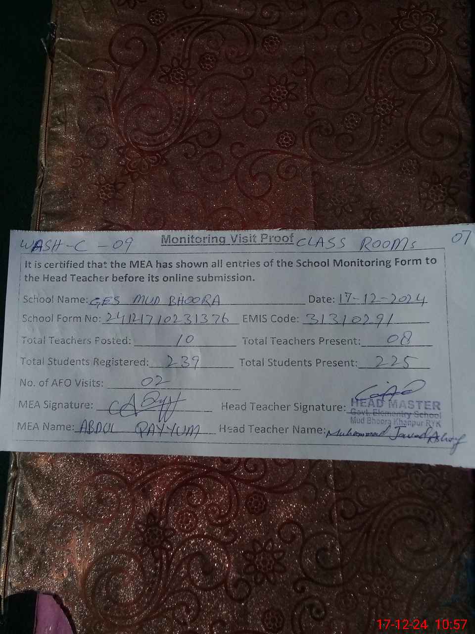 | Attendance Register | Head Teacher | MEA with School | Visit Proof |