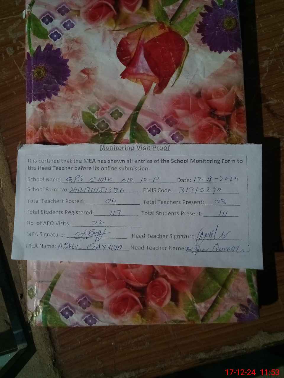 | EMIS Code: 31310290 | Name of School: GPS CHAK NO.10/P | |||
