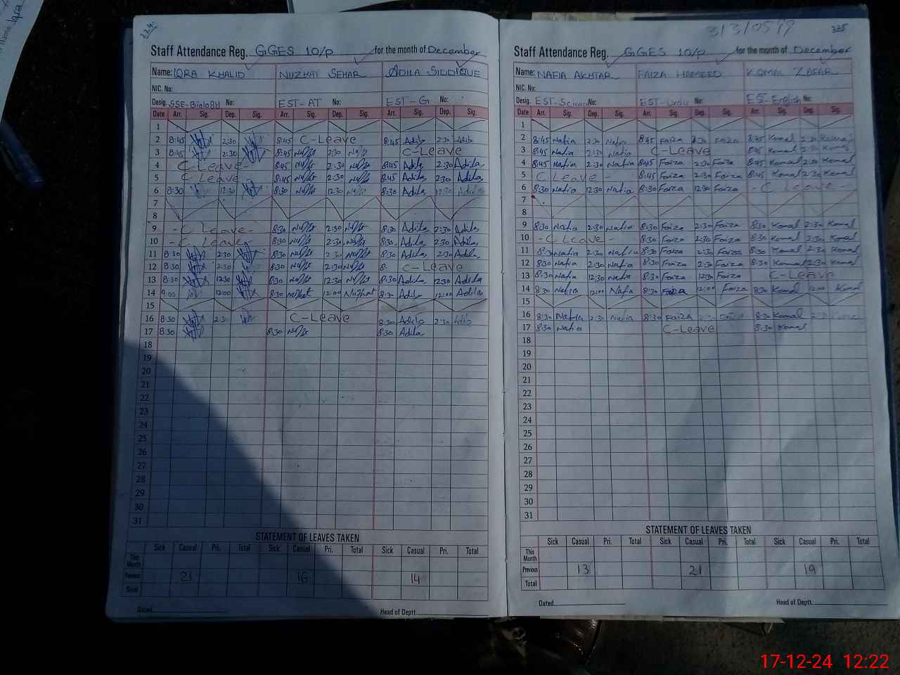 | CNIC | Full Name | Designation | R/C | Absence During Last Calender Month |